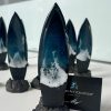 Estas tablitas no se cuelgan. Tienen su propia roca, esculpida a mano como base para que la puedas poner en vertical y lucirla en cualquier rincón con orgullo.